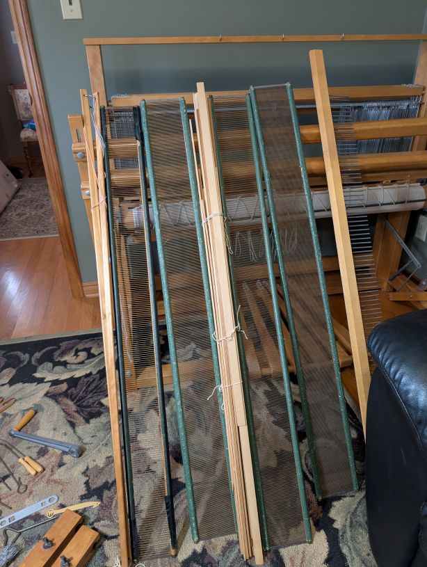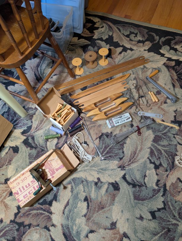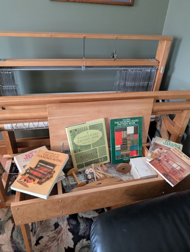 Nilus Leclerc II 45 inch jack floor loom, 4 harness. Includes an open ended bench, 4 reeds, lease sticks, raddle, bobbin winder, 3 boat shuttles, ski shuttle, 4 flat shuttles, box of bobbins, heddle hooks, etc. also 7 weaving books. Asking $3000 for everything or best reasonable offer. Can deliver for a fee.